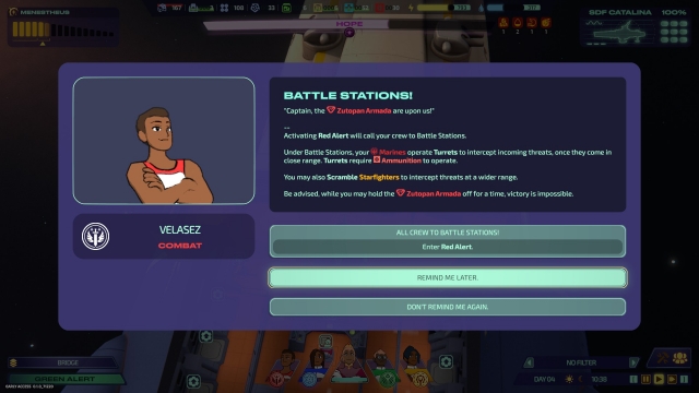 The tutorial begins shortly after you leave your home planet behind, and the first order of business is to get the SDF Catalina back to some semblance of normalcy. As your division officers give you a status report, you’ll observe the six different decks of the Starship: the Bridge, Promenade, Quarter Deck, Hangar, Lower Deck, and Engine Room. You can seamlessly shift up and down between each level by using the up arrow and down arrow, or the control key and your scroll wheel. The camera gives you an overhead perspective of each area, and everywhere you look, the ship is basking in an urgent red glow, but since you’ve put some space between your crew and the Zutopans, you can shift the Alert Level from Red Alert to Green Alert, giving the all-clear. For now, at least.