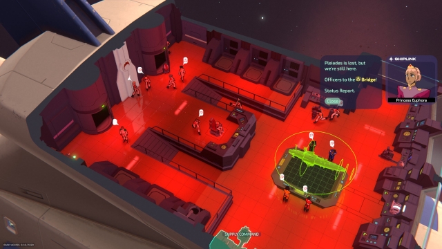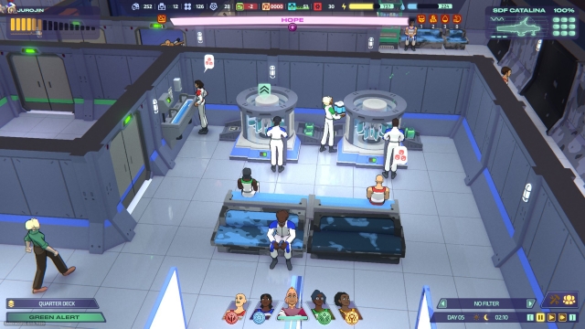 Another key part of keeping your Starship running smoothly is managing your crew. You can see an overview of all members in the Manifest, which is accessible at Euphora’s chair on the Bridge, or you can select any character in the environment, bringing up their personal report and viewing the Manifest using the provided button. From there, you can take stock of your crew’s emotions, health, and work assignment. Each character belongs to one of four divisions — Science, Combat, Supply, and Engineering — and you can transfer crew members to any section that needs extra help. The game implements rotating shifts so that a portion of your crew is Off Duty while the rest are on On Duty. However, the alert options that I mentioned earlier can override the shift system. Yellow, Red, and Magenta Alerts put all your crew on duty, which is helpful when something goes awry. Currently, this variety of options doesn’t seem to go in the other direction, though, in terms of giving characters a break. There were a few times I had wounded Engineers and starving Scientists walking around and still performing their jobs! I felt so bad for them, but I couldn’t shift their status to Off Duty, so I could only watch them hobble around with reduced movement speed. On the bright side, there’s no doubt that you’ve got a dedicated team standing by your side!