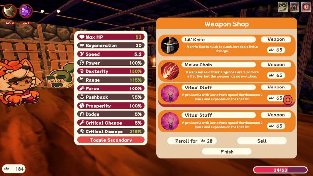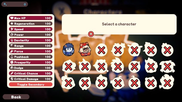 Gale is a wandering mercenary with a max health of 60 and regeneration of 35 along with 10 other unique stats. His attacks are Steady Blade which stabs nearby enemies and Ace Gale which attacks around you in a circle. Vixen is a huntress (in a cute fox costume) who has projectile weapons that pierce two extra times but her health is lower at 50 and regeneration of 20. Her weapons are Axe Gale, like Gale the other character, (that's going to be confusing) and Burning Blade which slashes nearby enemies. Other characters are unlocked by completing tasks like starting a run, getting a critical hit chance over 50%, or killing 1000 enemies. There are 21 characters total to unlock.