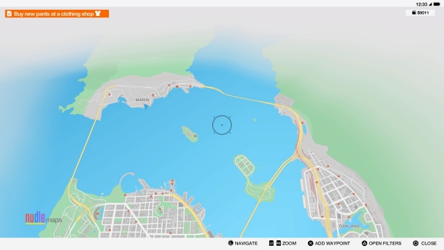 The map is made up of four areas. San Francisco is the biggest part with many missions here but that's not stopping us from taking a trip to one of the other parts of the map. Marin is the smallest town to venture around, it's easy to get in and out and is a quiet little area. Silicon Valley is at the bottom of the map where you can find Nudle (which is basically Google), and finally Oakland is the next size up to the right of the map where it has green grass and a lovely spot to race your boat or quadcopter.