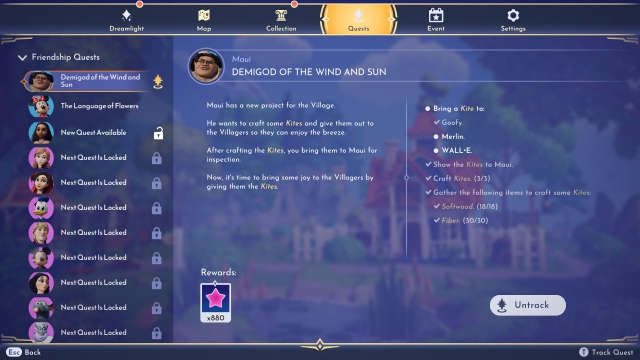 One of the most important features is the friendship system, as it's what helps you connect to the nostalgic characters. Although watching Goofy fishing in the meadow or hearing Merlin yell at you to have a great morning is enchanting in and of itself, being able to interact with them in a much more personal way is fantastic. Although the system is similar to Stardew Valley — being able to talk to them once and also gift them daily — the themed rewards and additional quests make it that much better. They're quite true to the characters too!