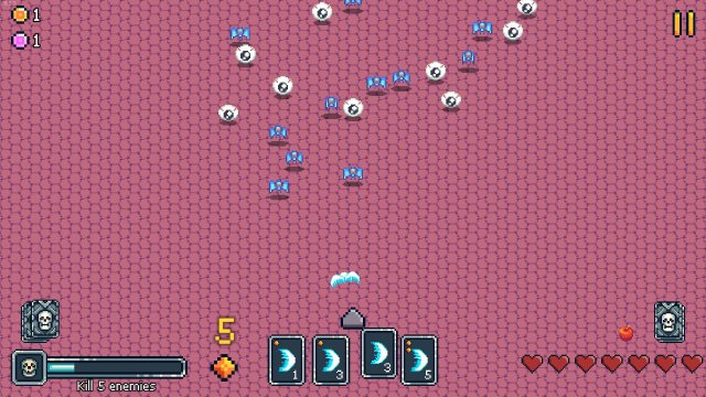 You'll earn gold during runs, which is used to unlock more cards to obtain in subsequent attempts. I like that you can disable getting certain cards as rewards because, depending on what you unlock, it makes other choices obsolete. A one-cost single bullet can easily be replaced by a one-cost laser shot. There are some really interesting cards available, and it’s all earned just by playing the game more and more at a reasonable pace.