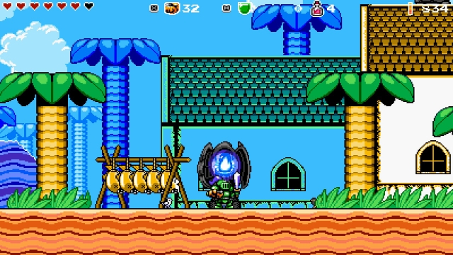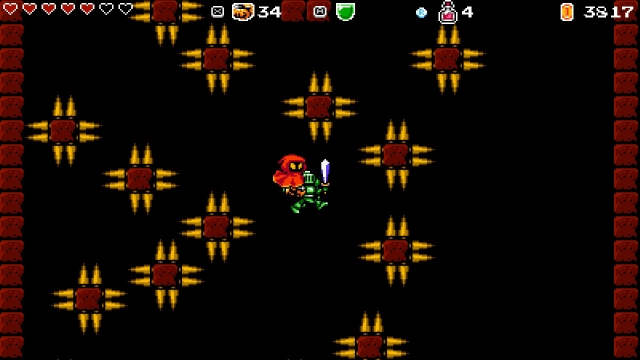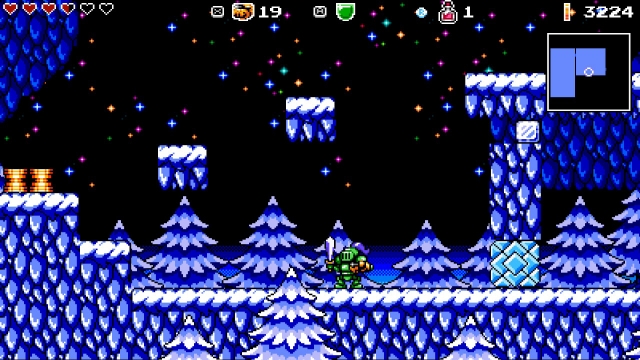 Boss battles aren’t the only moments which require focus. It’s also a necessity for navigating the game’s varied, if a little uninspired, pixel art environments. These range, rather abruptly and incoherently, from jungles to snow-capped mountains, and grand temples to tropical villages. Contextual clues, sometimes fiendishly subtle ones, give away the locations of secrets throughout these environments: treasure, ammo capacity upgrades, hidden paths, health upgrades and other surprises. Occasionally, these contextual clues aren’t even on the same screen as the secret itself; instead, the secret is teased in the next screen over. The game asks players to think outside of the box to solve its puzzles and platforming challenges. One instance involving the use of an enemy’s projectile to dislodge a much-needed key stood out as a particularly clever example of how the game subverts players’ expectations in this respect.