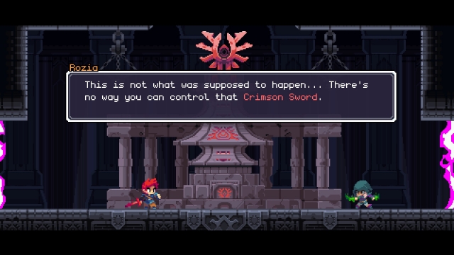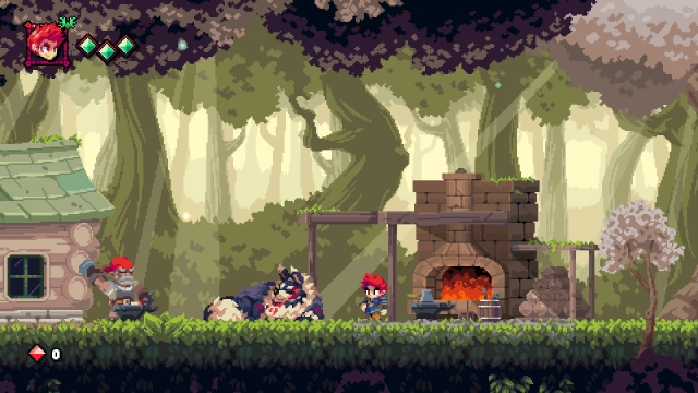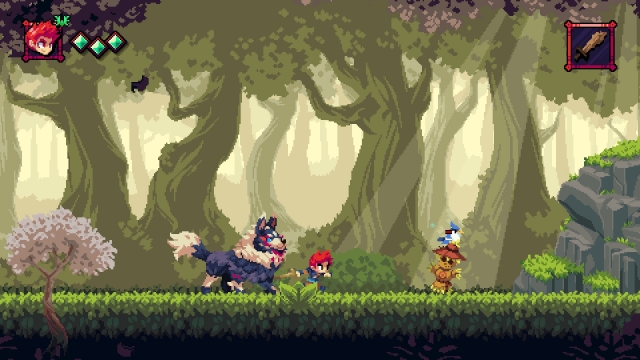 The soundtrack for Flynn: Son of Crimson is great. At times it reminded me of the music you would hear in Chrono Trigger. It fits perfectly with the beautiful pixel-like graphics of the game. The backgrounds are brightly coloured, and there are animated elements layered on top of the back layer like leaves and birds. Having the birds fly away when you get too close was a great addition. That really brings the environment to life.