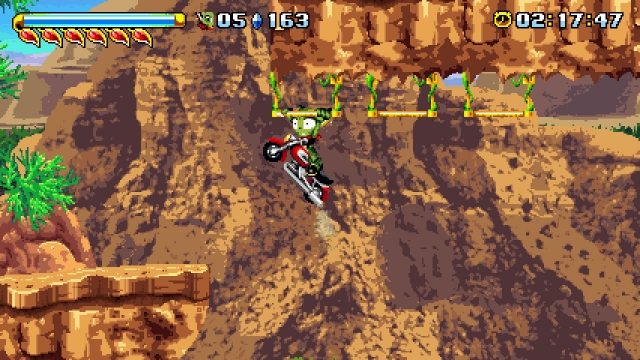 Just like the games that influenced it, Freedom Planet features the usual plot of freeing the world from the clutches of an evil genius with lots of robotic creations, and sees you running as fast as possible through various environments to do so. There’s no jumping on the heads of enemies, instead you have weapons and special moves at your disposal. Depending on which of the three characters you choose to play as, this could be a spinning attack, a shield, or even a motorbike you can ride through the levels. This also means that there are different potential routes through the levels depending on which character you play as. The levels are very well designed so you won’t feel like you’re missing out too much, but it does give a reason to replay the game as another character after completion.