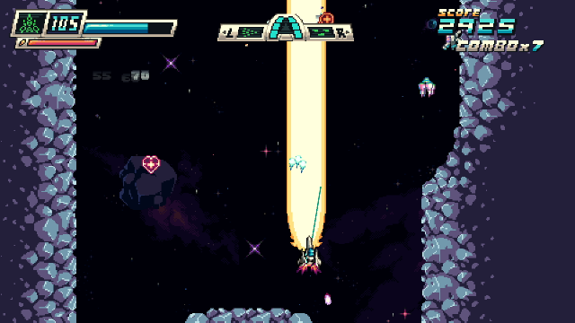 This indie shoot ‘em up (shmup) takes traditional scrolling shooter gameplay and blends it with twin-stick style shooting mechanics and a pinch of roguelite progression. It’s clearly inspired by traditional old school retro shoot ‘em ups, most notably Konami classics like Gradius and especially Salamander with its love for mixing vertical stages in with the horizontal!