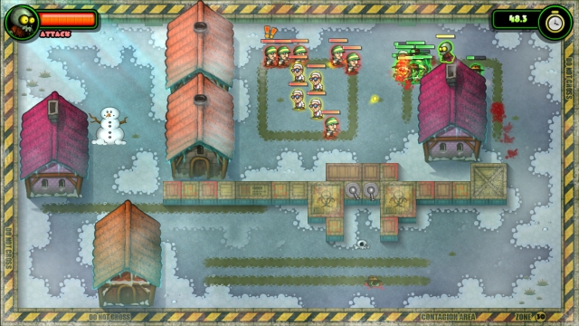 In I, Zombie, players are tasked with killing every human in each of the 30 levels present in the game while controlling everyone that gets turned with three different commands: attack, stop, and follow. Each of them does exactly what you'd expect them to do, and you must use these commands to kill military men armed with rifles that will open fire once they catch wind of you.