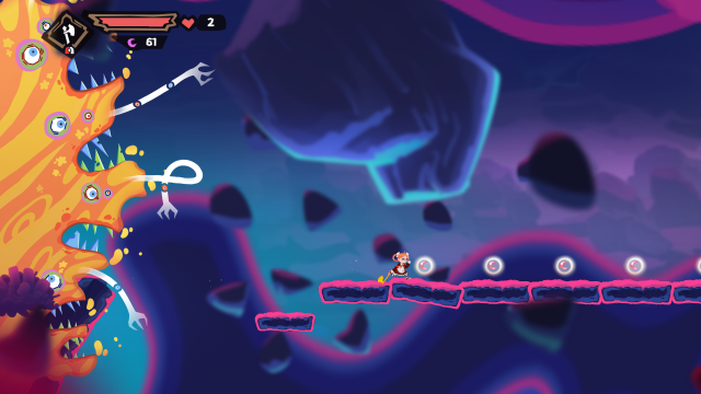 Most of the problems I encountered came down to two main things: accuracy and responsiveness. The whip, for example, sometimes had a delay that would make me miss jumps, or it just wouldn’t latch onto a ring, even if the animation showed it touching the very thing it was supposed to interact with. Wall climbing, however, almost made me rage-quit the game, which I haven’t done since playing something actually designed to make you frustrated, like Getting Over It with Bennett Foddy. The game would frequently put you in a position where you’d have to attach your axe to one wall and jump to an opposite wall, repeating that until you reached your destination above, but the problem was that it wouldn’t recognise which direction I was trying to jump, and more often than not, I’d jump the wrong way and fall back to my starting point.