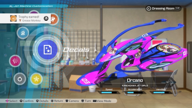 This game is full of things to customise, you not only get to choose the paint colours on your jet ski but you also get to choose what decals and where they will be placed on the machine. When you race you earn points to use as currency in the shop. There are a lot of different things you can buy like outfits, accessories, background music and even parts for your jet ski. The parts can increase the speed of your craft, the handling and even the acceleration but it will cost you. This store is expensive! The cheapest part cost about 20,000 points, which is a lot when you only have 29,850 to spend! You will have to do a lot of races to get all the points you need to really soup up your jet ski. Once you have your craft looking the way you want you can also decide what outfits your characters will be wearing and the colors of their hair. Want the school girl look? There is an option for that. Want a super tight wet suit on your character, you can do that too. Want Rin to have long purple hair with pink highlights? Sure, why not! The options are endless and as you race against other teams you unlock more outfit and accessory options.