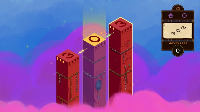 The core gameplay loop is a relatively simple maths-based one. You are presented with a series of pillars containing different numbers of gems on each. Your task is to get the gems from their current position to a different one that the game asks for. You can’t just move the gems wherever you like though, the number of gems you can move is determined by the distance moved. For example, if you are moving from pillar one to pillar two, you can only move one gem, but if you are moving from pillar one to pillar five, you can move four gems. Added to this, you have to get the gems to their final location in a limited number of moves, and on some levels you can only move them in one direction. It’s a reasonably complex mechanic to describe in text, but I promise when you actually play it’s super simple and you will pick it up very quickly.