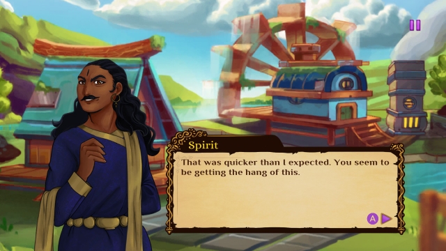 One of the things that the developer is keen on pointing out is that this is a story-based puzzler, and indeed it is a charming story about a protagonist on a mission to save ancient Indian villages with the help of a friendly spirit. This is told via cutscenes every few levels in a lovely hand-drawn artstyle. Each village has its own look and feel, so these evolve throughout the game in a natural way, without looking too out of place.