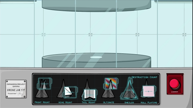 When Paper Nebula begins, we see Vela, the main character in the Drone Lab, talking with the AI named TR — short for T00K11L - R, who is in charge of the drones. Drones are paper aeroplanes that you will be flying and frequently destroying. He is working on restoring the previous functions that the drones had, so he does research based on the alien crafts you destroy on your runs. After multiple attempts, you will unlock upgrades for your drone. There are six different areas of the ship that you can power up: Front Mount, Wing Mount, Tail Mount, Ultimate, Shields, and Hull Plating. Each has three different levels to unlock, as you equip each one, the game will become a little bit easier. For the first hour, I was stuck on Zone 1, only making it to the second area a couple of times, but the more I played, the more stuff I unlocked, making the run a bit easier.