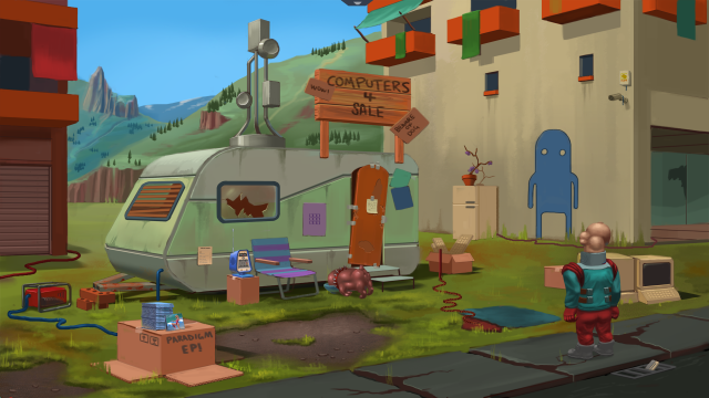 However, where things really go utterly bonkers in a very “golden era of adventure games way” is the story. You play as Paradigm, a mutant with a sentient, talking tumour who works at a nuclear power plant and whose true dream is to become an electronic musician. One morning when he tries to boot up his computer to make some “phat beatsies”, he discovers the operating system is broken. A minor inconvenience, but one that is soon revealed to potentially threaten the entire world. Because you see Krusz happens to have the largest concentration of nuclear waste in the whole world underneath it, and Paradigm’s music-making computer just so happens to double as a regulator for the nuclear reactor in the plant. And that’s just in the first ten minutes.