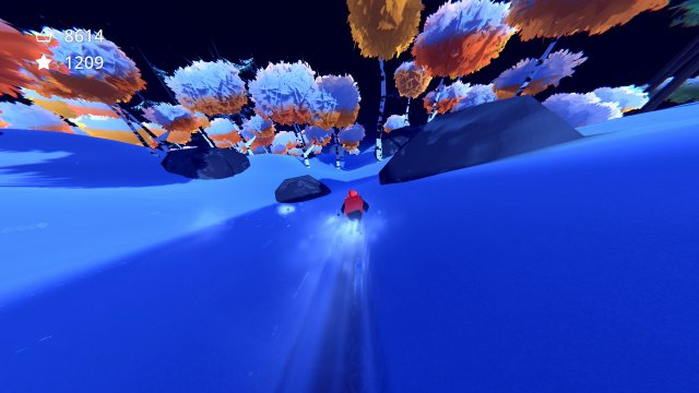 Mountains are procedurally generated, with different biomes, obstacles, and weather. Not only do they look really pretty, but they can also provide a serious challenge depending on what the conditions are. You can be skiing in the dark through a forest of trees or in the middle of a blizzard where you can barely see anything in front of you. It makes each run a little exciting to see; I definitely loved it when I got mountains that just consisted of steep hills with rocks and tree trunks to use as ramps for big air. You can retry mountains and even save them if you want to practice them, so you’re not always riding down different biomes every time.