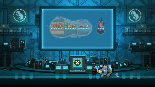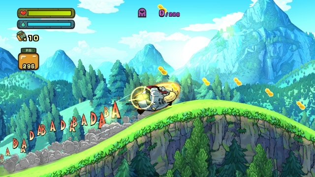 TEMBO THE BADASS ELEPHANT is as beautiful as its premise is hilarious. The 2D art style of hit indie titles gone by is ever present but has somewhat of an action cartoon twist. As you run through cities and hillsides, the rumbling footsteps are met with an onomatopoeic ‘badadadada’, bombs explode with a declaration of ‘boom’ and Tembo’s introduction sees him raise his trunk with a ‘hraaaah’ as if to say ‘bring it on, bitches’. The background isn’t just a static image either, it’s a living, breathing landscape that moves alongside you and features passing helicopters, and invading PHANTOM patrols, making you feel that much more part of the invasion.
