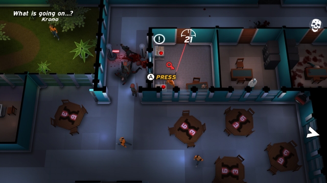 Also, those special abilities I mentioned earlier? There are some light puzzle solving that incorporates those, to disastrous effect. These puzzles should provide a nice change of pace from the twitch action of the rest of the game, but because these abilities are entirely reliant on chaining together a very specific number of kills, it more often than not becomes an exercise in frustration. Laser grids will bar entry to important locations, but can only be circumnavigated by the dash ability. So, if you already used up you special, or (God forbid) played too well and killed enough people to bump your special gauge past the dash attack, you have no option other than to restart. It’s the Goldilocks of game design where the player has to kill not too many, not too few, but just the right number of bad guys to progress.