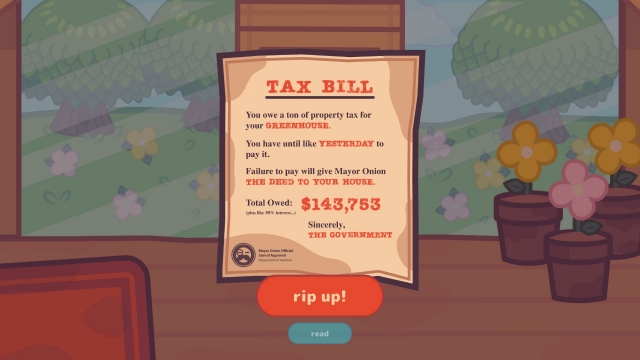 Snoozy Kazoo has brought one of the craziest named games I have personally seen; Turnip Boy Commits Tax Evasion. Tax evasion isn’t the usual topic of games, let alone a turnip not paying his taxes so I had to see for myself how this could be a fun game. As soon as the game begins we meet our tax evading hero Turnip Boy. He’s super cute, very quiet and has a penchant for tearing any paper he sees. Turnip Boy is in huge financial trouble, he receives a tax bill from Mayor Onion stating that he owes a whopping $143,753 in tax on his Greenhouse that is located in Veggieville. The bill also makes sure to say that this also includes “like 50% interest”. If he doesn’t pay the deed to his Greenhouse it will go directly to the Mayor. Turnip Boy responds by ripping up the bill.