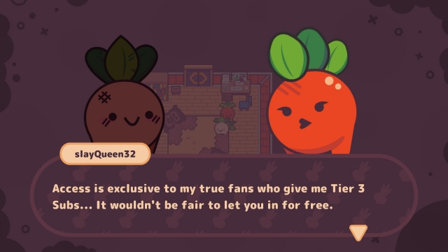 Turnip Boy Commits Tax Evasion has a 16-bit aesthetic look to it. The music is cute but can definitely get repetitive after a while. The game has a great sense of humour and is full of silly food puns. One character is a beet and since she’s a gamer who streams she tells you that she only lets "3rd tier subs" through. You discover that she’s not talking about being a subscriber to her stream, she means an actual sub. I also love the fact that Turnip Boy can not resist ripping every single piece of paper he finds. Even if you don’t want to tear it up you only have two options: to read it or rip it. I did feel a little guilty when the one construction worker showed me his work permit and I tore it to shreds.